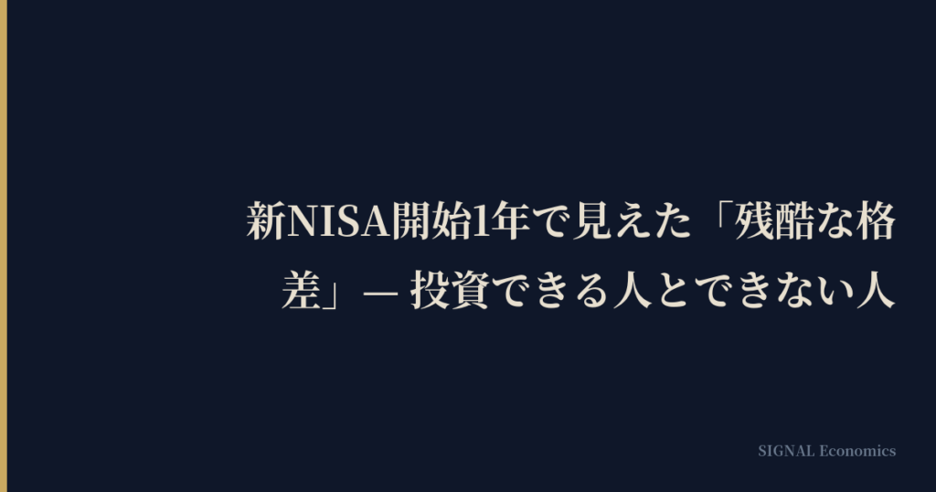 結論として、新NISAは日本の資産形成文化を根本的に変える可能性を持つ優れた制度だが、その恩恵が国民全体に行き渡っているとは言い難い。投資できる余裕のある中高所得層はさらに資産を増やし、生活費に追われる低所得層は制度の恩恵を受けられない。この「残酷な格差」を縮小するためには、3つの施策が必要だ。第一に、学校教育における金融リテラシー教育の義務化(2022年に高校で開始されたが不十分)。第二に、低所得者向けのマッチング拠出制度(政府が投資額と同額を上乗せする仕組み)の導入。第三に、実質賃金の回復による投資原資の確保だ。新NISAという「箱」は整ったが、中身を入れられる人と入れられない人の格差をどう埋めるか。それこそが、日本の資産形成政策の最大の課題である。
