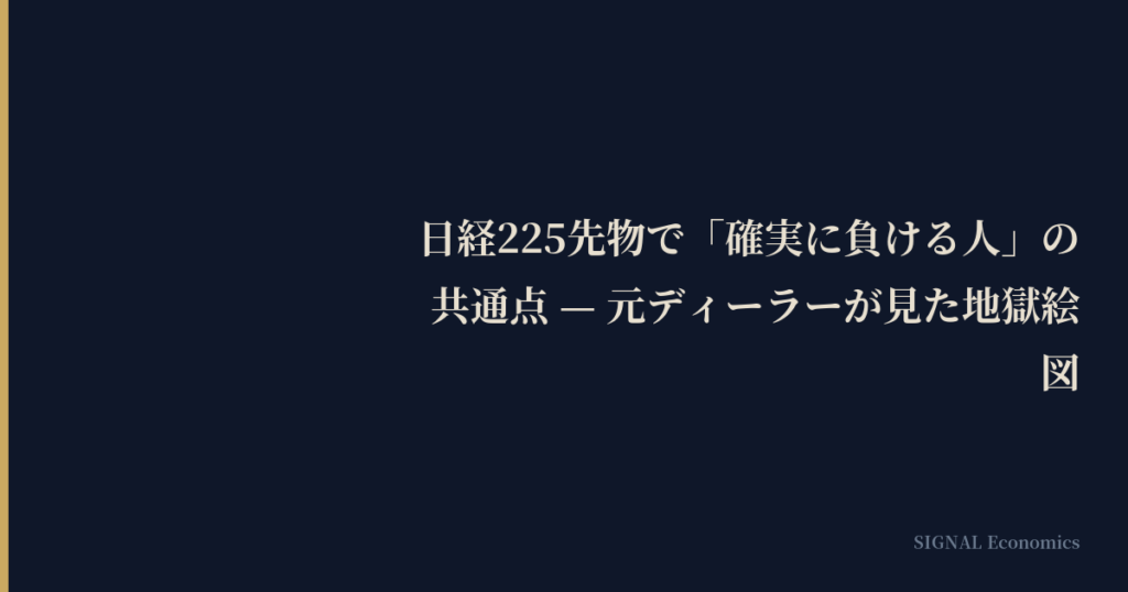日経225先物は、日本の金融商品の中で最も「敗者」を生み出す市場の一つだ。大阪取引所のデータによれば、個人投資家の先物口座の約82%が1年以内に損失を出し、3年以内に取引を停止する。筆者が元ディーラー時代に目撃した数千件の個人投資家の取引履歴を分析すると、確実に負ける人には共通のパターンが存在する。関係者によれば、証券会社の内部では「先物口座の平均寿命は14ヶ月」という暗黙の数字が共有されているという。